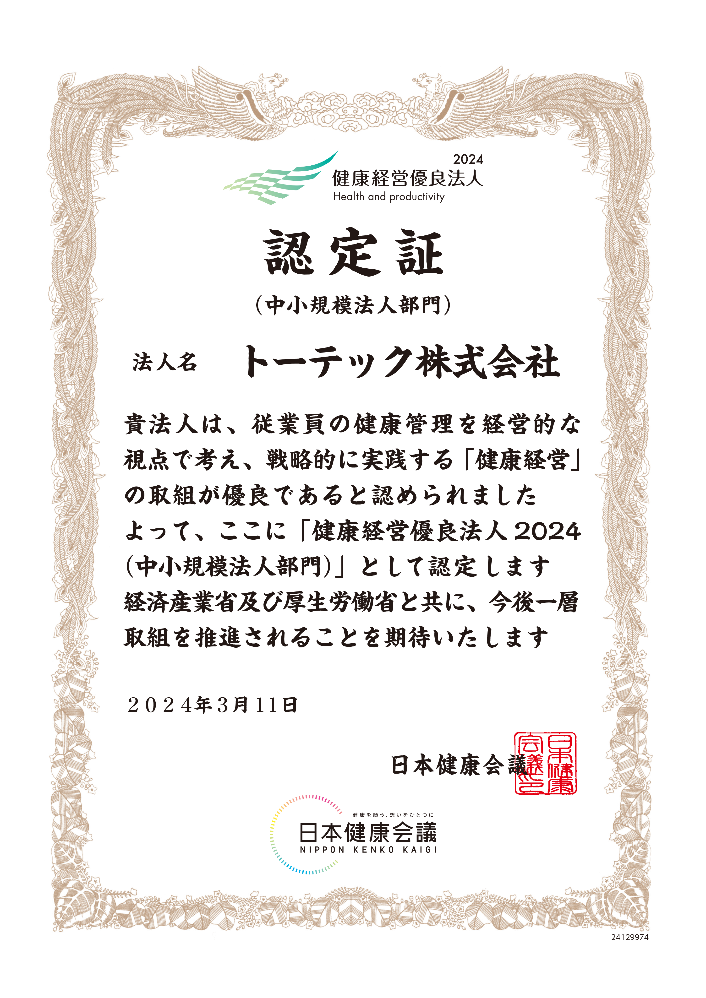 「健康経営優良法人2024」の認定を取得しました。(2024.03.11)2024.03.11